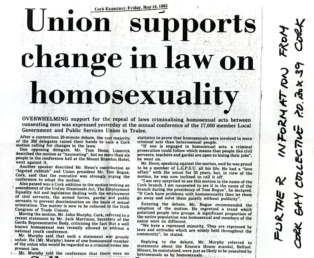 The trade union movement was hugely important in progress for LGBT people in Ireland from the early 1980s when we had few supporters but many powerful enemies. This history is largely unrecognised and unwritten, significant exceptions to this are Orla Egan and the Cork LGBT Archive, and Dr. Patrick McDonagh’s great research in his book ‘Gay and Lesbian Activism in the Republic of Ireland, 1973-93’ (2021).