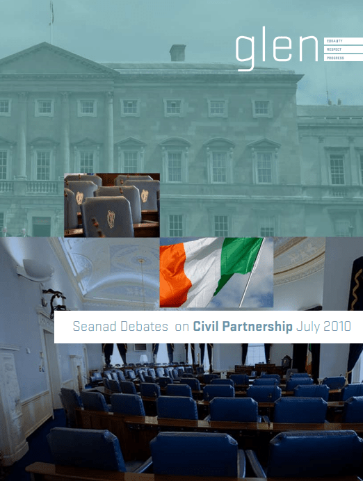 Two reports were compiled by GLEN comprising second stage parliamentary debates on Civil Partnership in both Houses of the Oireachtas / Irish Parliament (Dáil Éireann and Seanad Éireann).