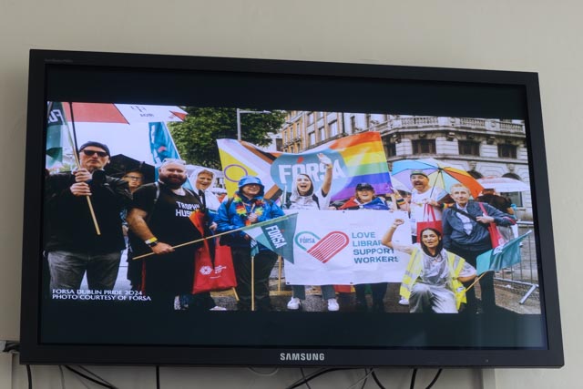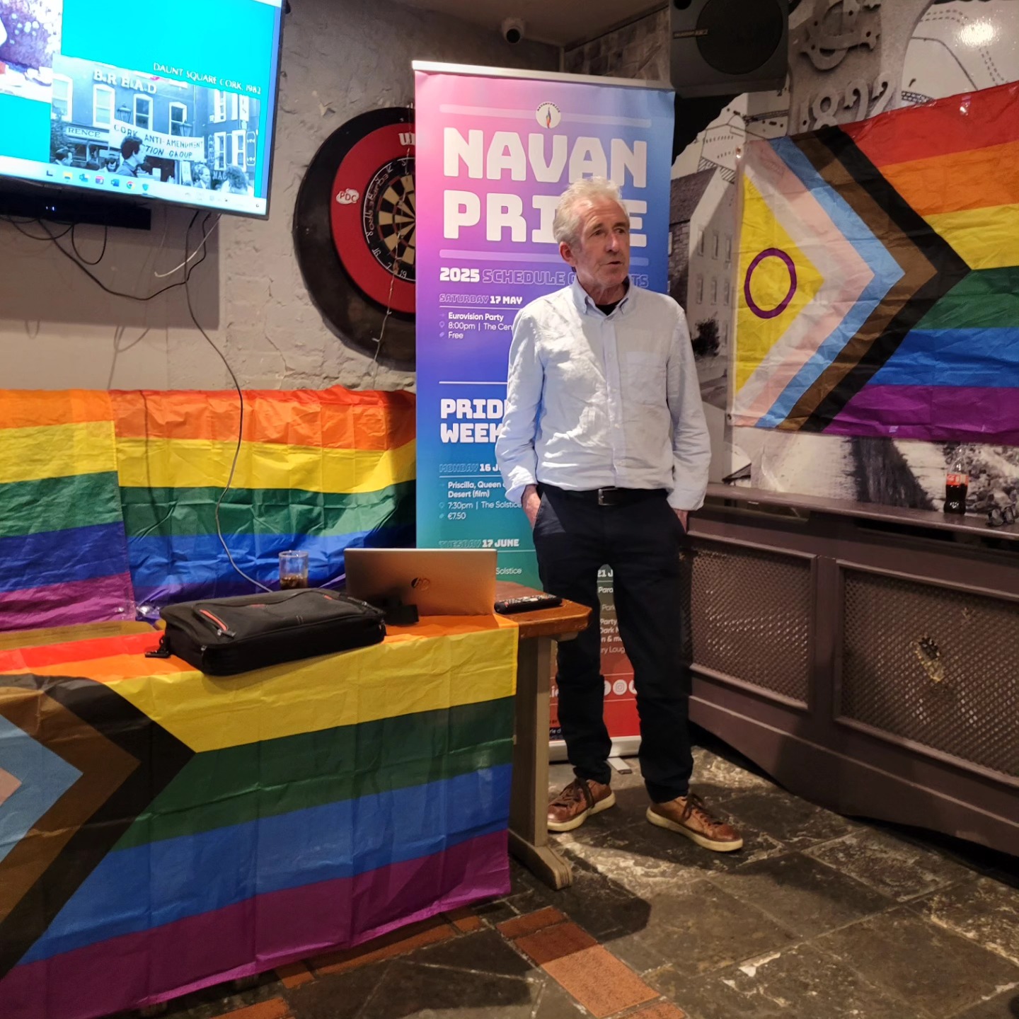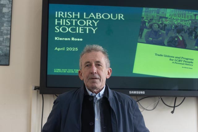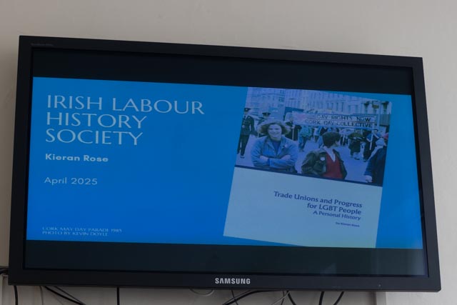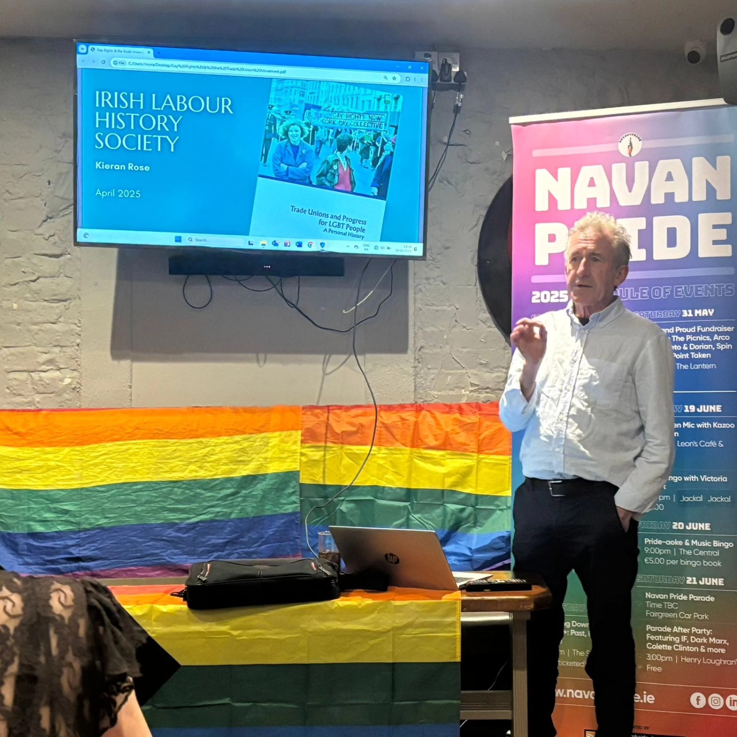 In April 2025, Kieran gave a talk at an event hosted by the Irish Labour History Society at ILHS headquarters (Begger’s Bush, Dublin) examining the impact of the trade union movement on the struggle for LGBTQ+ rights in Ireland. The event was chaired by Shay Cody, President of the ILHS. Also in attendance was Bill Foley (partner of the late Christopher Robson) and Proinsias de Rossa who played a very important role in progress for LGBT people. Photos courtesy of Eddie Soye.